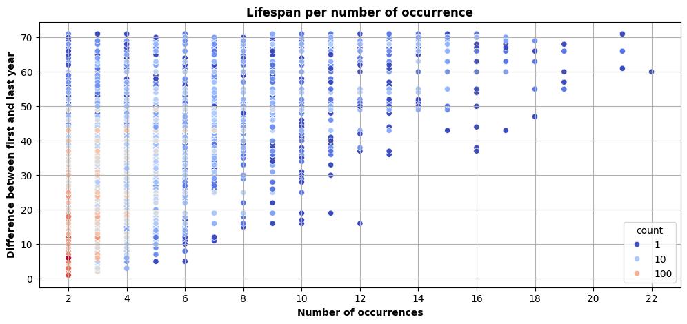 Figure A11: Lifespan of the detected objects based on their first and last detection and depending on the total number of occurrences for the canton of Ticino. As several objects can have the same lifespan and number of occurrences, the points are coloured to indicate the total number of objects concerned.